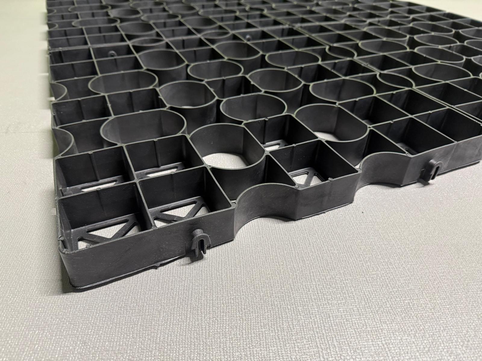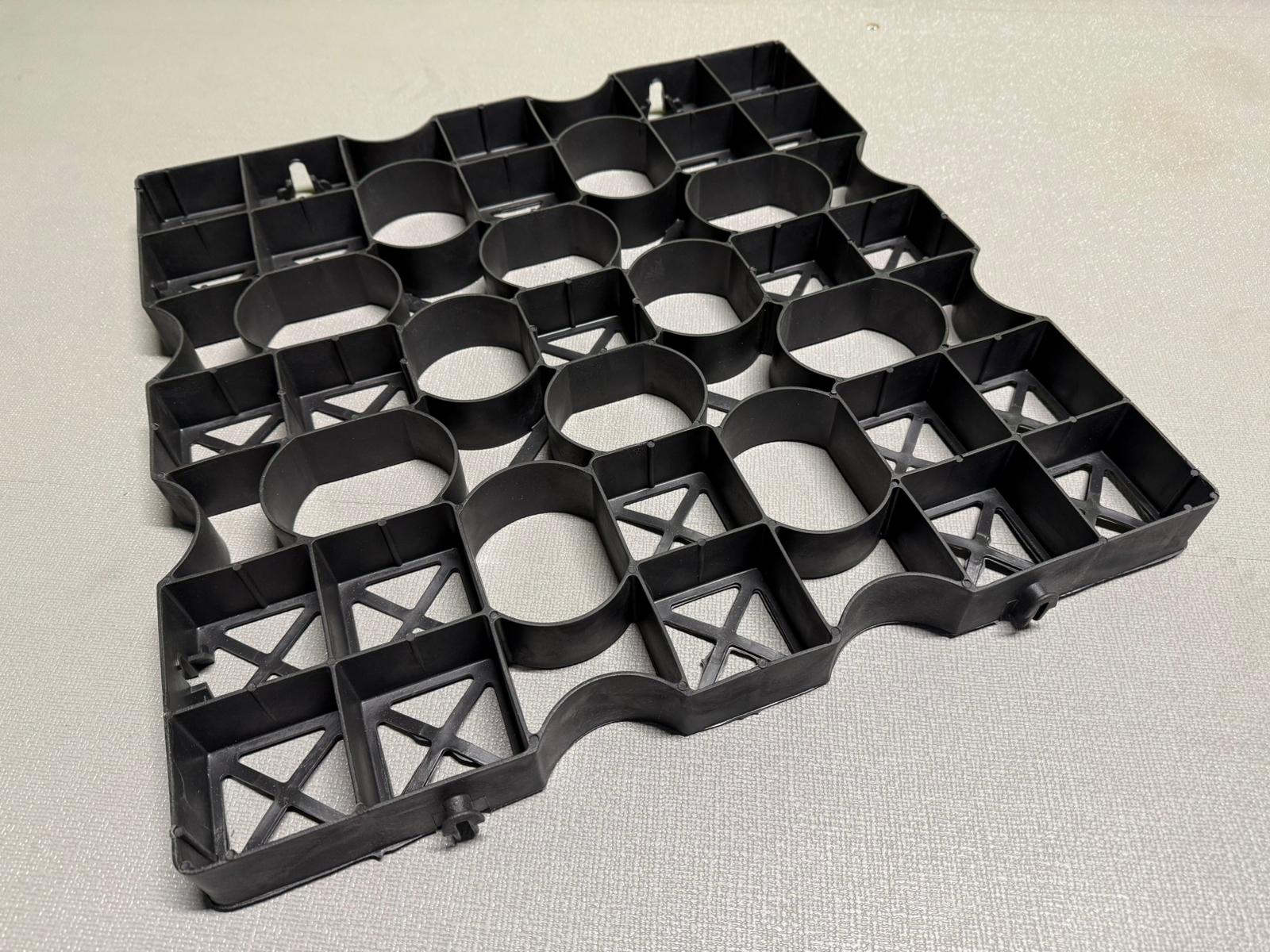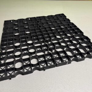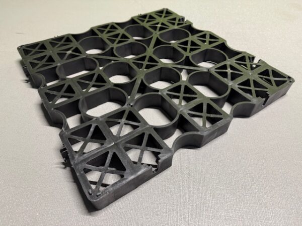 Eine vollständig recycelbare, halboffene Pflasterplatte, ideal für Rasen- und Split- o.ä. Anwendungen.
