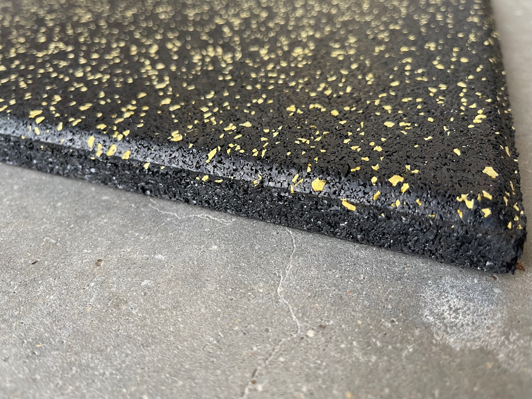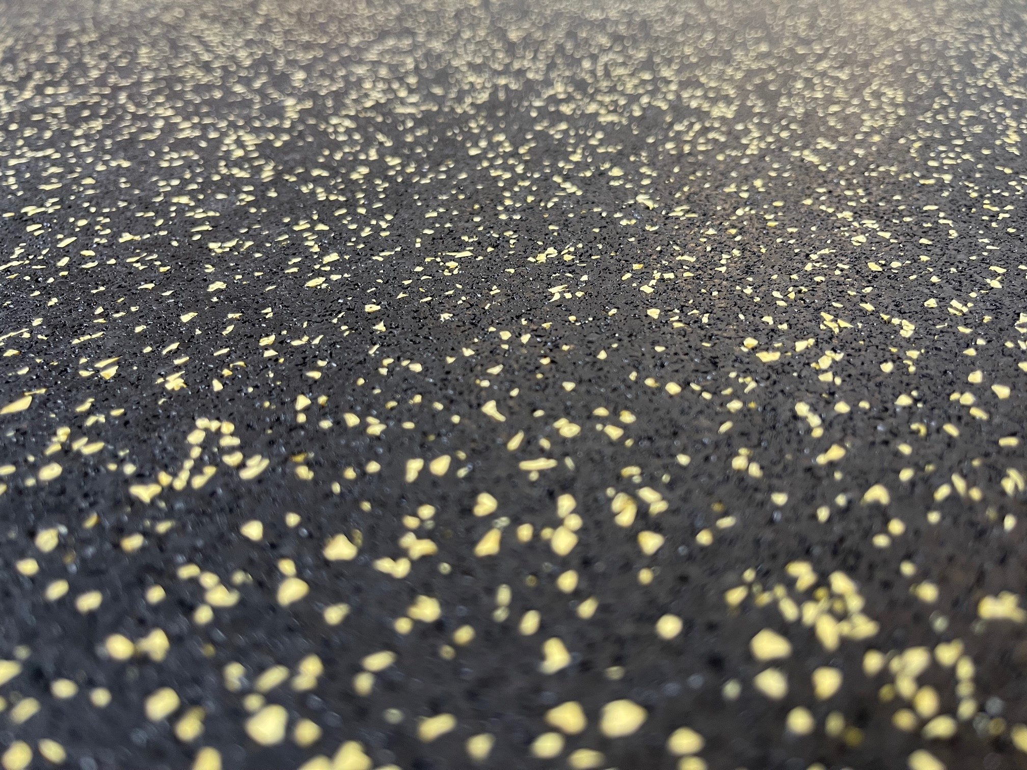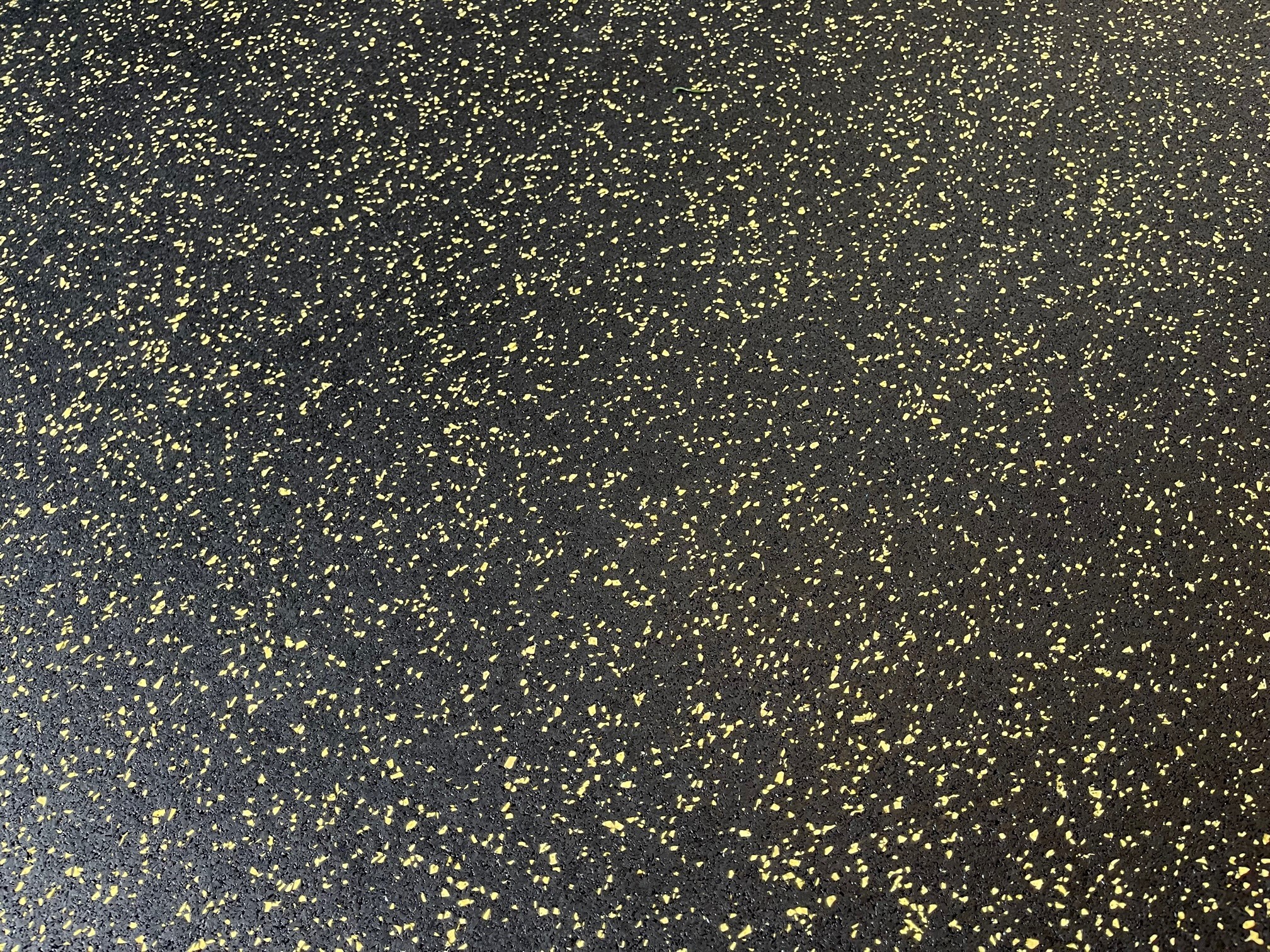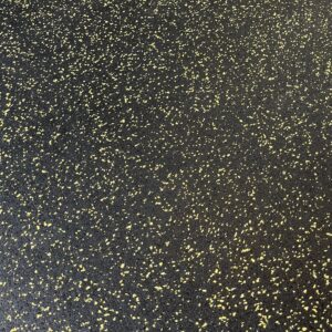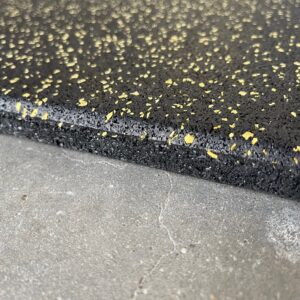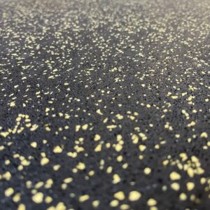 Die CrossProFlakes-Serie ist eine reine Indoor-Fliese mit einer 17 mm dicken SBR-Unterseite und einer 3 mm dicken EPDM-Oberschicht mit “Farbflocken” in Gelb (auch in Grau, Rot und Blau erhältlich)