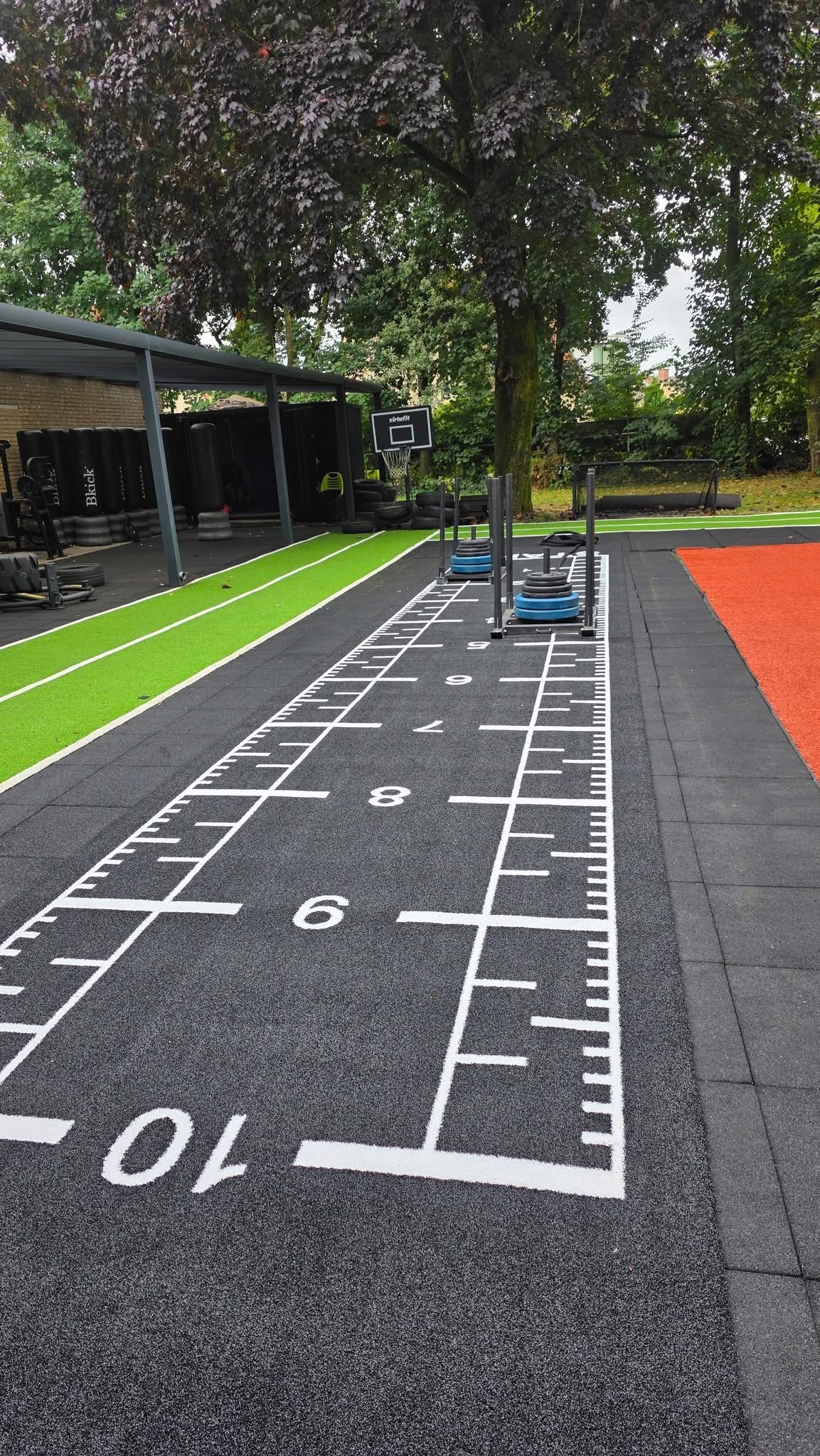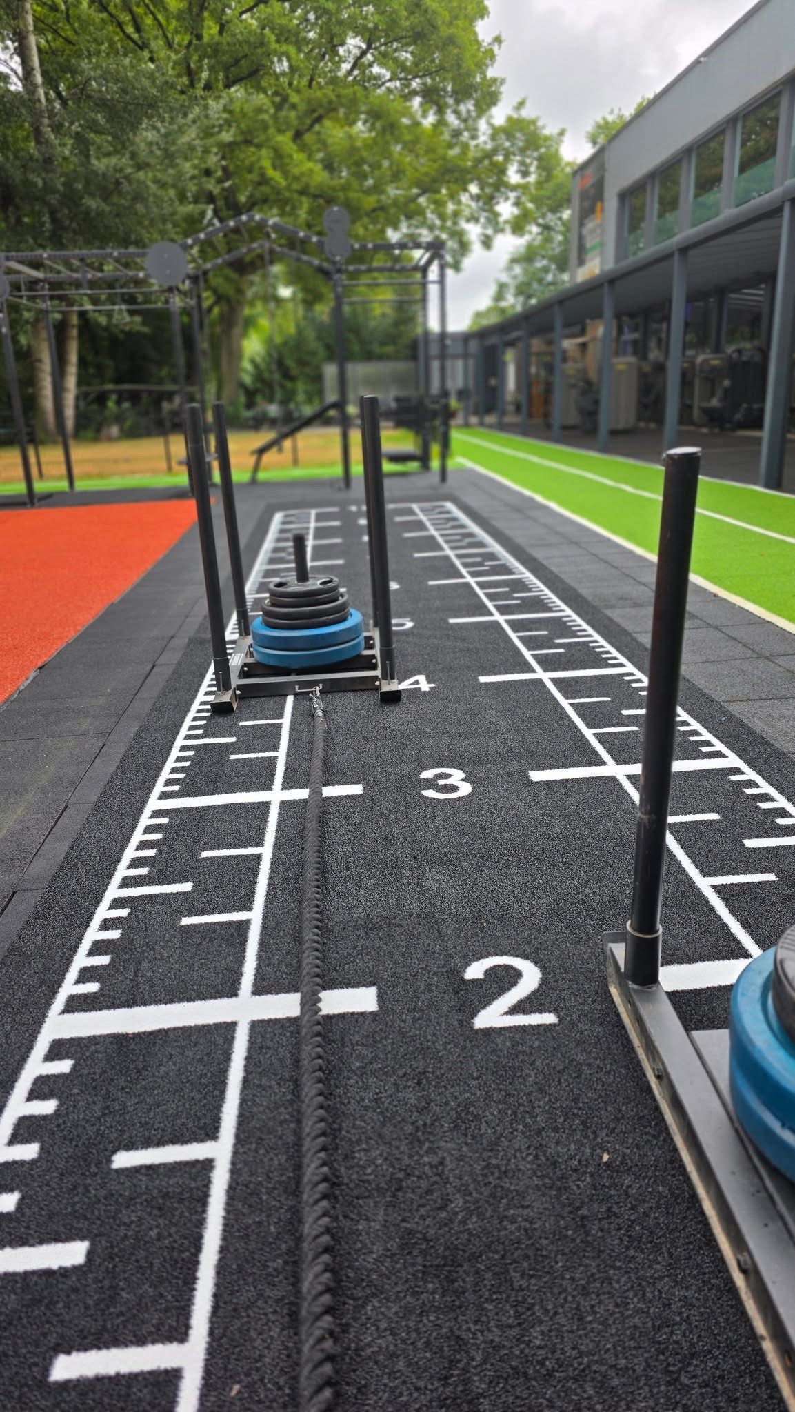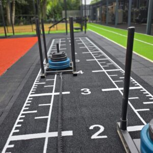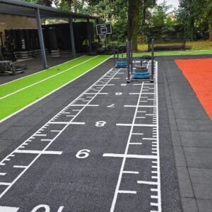 Dieser Sprinttrack hat einen zusätzlichen unifarbenen Meter vor dem Start als Anlauf und einen zusätzlichen Meter nach dem Ziel als Auslauf, was einzigartig für Sprinttracks ist, dies ist, um zusätzliche Leistung am Anfang der Power-Session und Schieben der Crossfit Schlitten zum Beispiel zu bieten!
